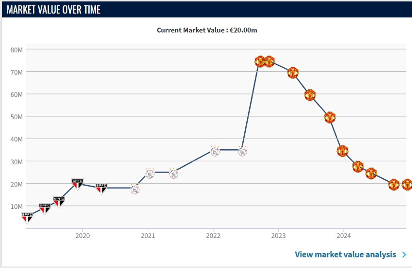 本賽季25歲的安東尼自曼聯(lián)租借至皇家貝蒂斯后狀態(tài)火熱,為皇家貝蒂斯出場11場已打入4球,并有4次助攻,且多為關(guān)鍵進(jìn)球,幫助皇家貝蒂斯近期斬獲西甲五連勝??伤纳韮r卻與去年12月份相同,仍為2000萬歐元。