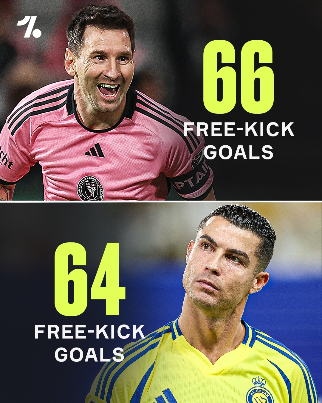 而梅西和C羅職業(yè)生涯至今分別打進了66粒任意球和64粒任意球。