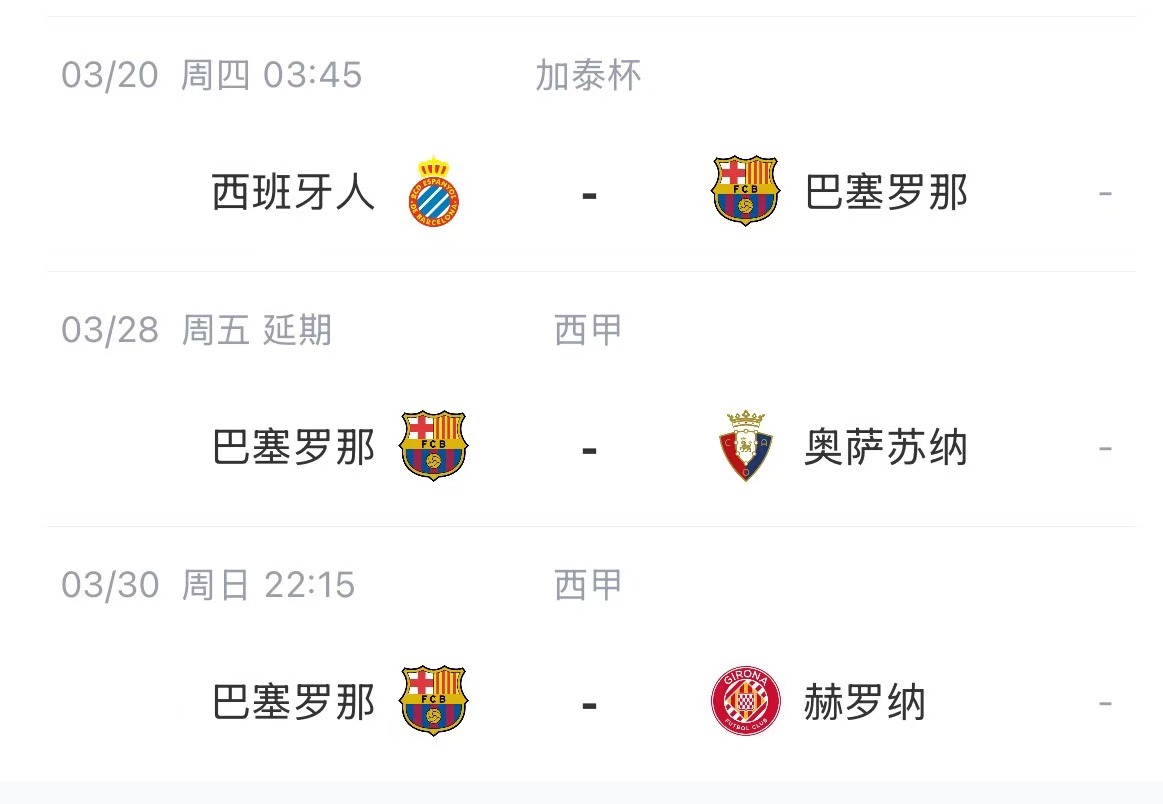 巴薩羅那vs奧薩蘇納比賽具體時間還未確定,目前定于西班牙當(dāng)?shù)貢r間27日。這也意味巴薩可能將于本月底面臨三天兩賽。