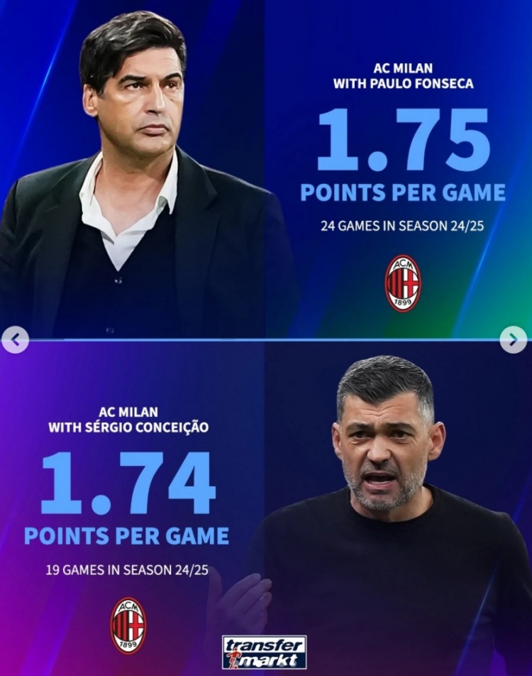 本賽季中途換帥6支球隊(duì)場均積分變化:曼聯(lián)提升0.36分,米蘭下降